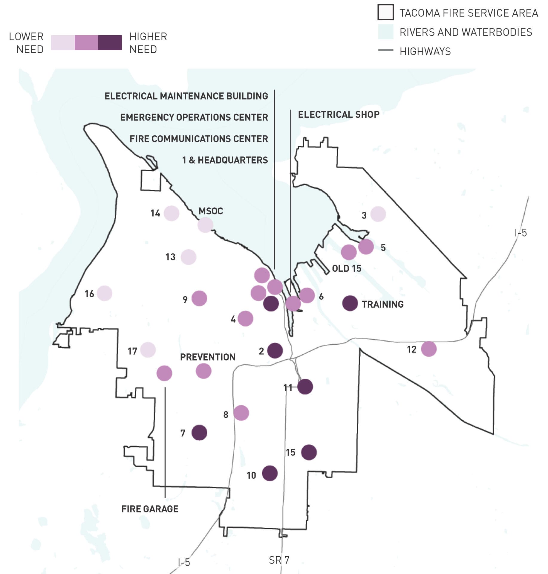 We worked with the Tacoma Fire Department (TFD) to improve emergency response, protect firefighter health, modernize facilities, and build resiliency in a growing community. With rapidly increasing call volumes and 33% historic structures, TFD’s facilities are undersized and outdated for modern firefighting needs. MAKERS incorporated the latest trends in clean station design to prioritize firefighter health and well-being in future facilities. This plan recommends solutions to existing facility issues and prioritizes future facility investments.